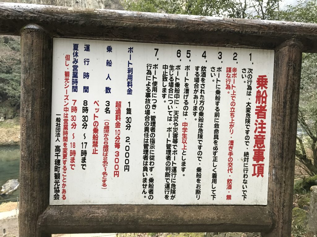 高千穂までは信号もなく、とても走りやすくてよかったのですが、高千穂峡のボート乗り場(塩御井駐車場)の場所がわかりにくくて何とか到着しました。