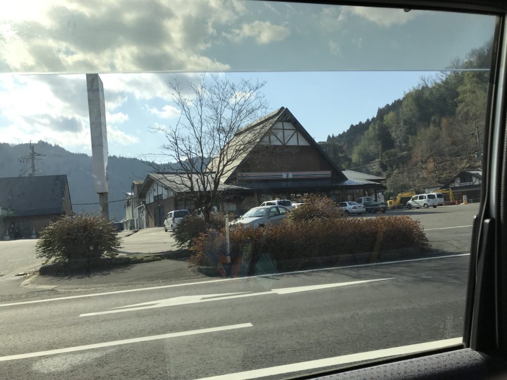 午前9時出発、国道210号線を東に向かって行くと大分県日田市にある昭和レトロなセブンイレブンを発見。